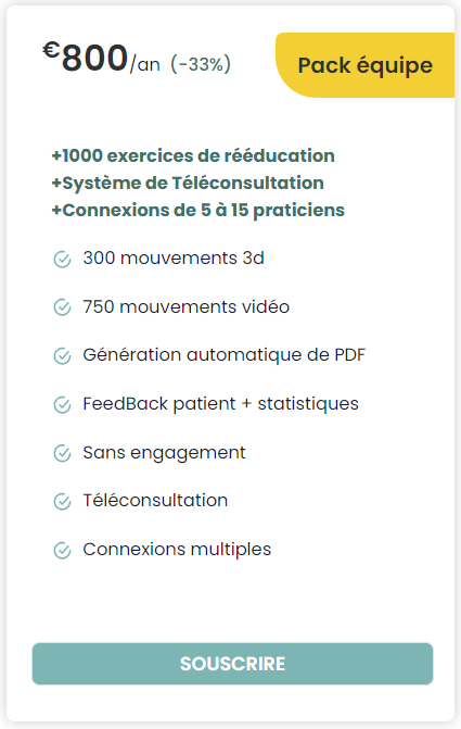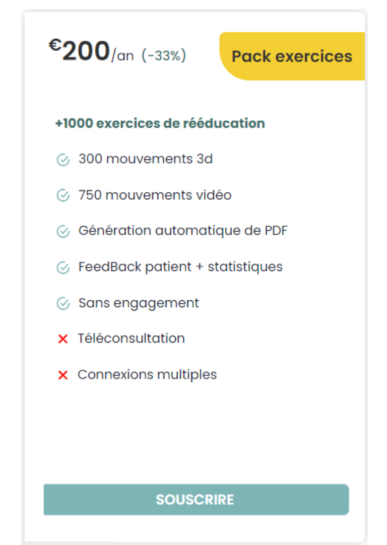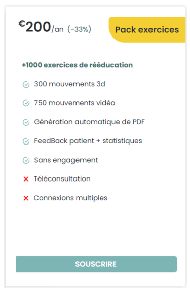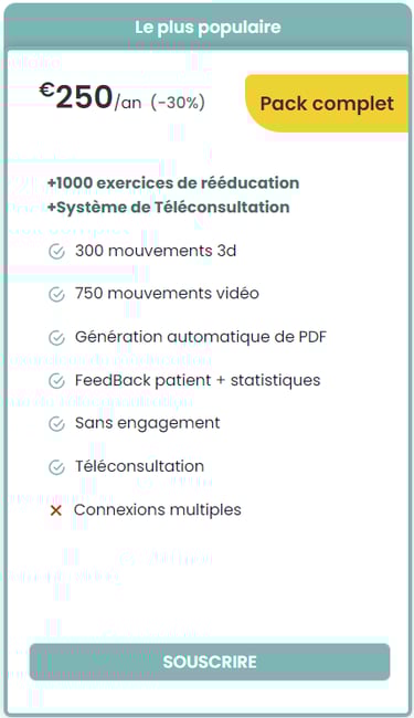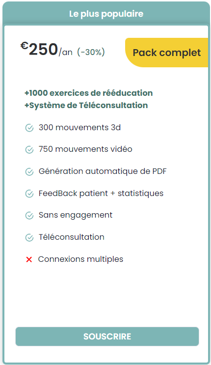 Le Pack Complet inclut toutes les fonctionnalités du Pack Exercices, avec des outils supplémentaires comme la télé-rééducation.